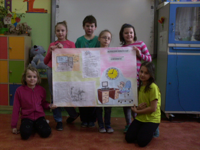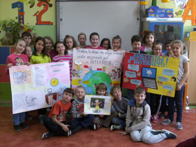 DZIEŃ BEZPIECZNEGO INTERNETU"Wiedzą to dzieci na całym świecie, wiele zagrożeń jest w Internecie."Uczniowie klasy 3a w kilkuosobowych grupach wraz z rodzicami wykonali wspaniałe plakaty mówiące o bezpieczeństwie w Internecie. 9 lutego 2015 r. dzieci prezentując swe prace mówiły o przestrzeganiu reguł rozsądnego spędzania czasu przy komputerze, możliwościach Internetu i zagrożeniach jakie może sprawić niewłaściwe korzystanie z jego zasobów.