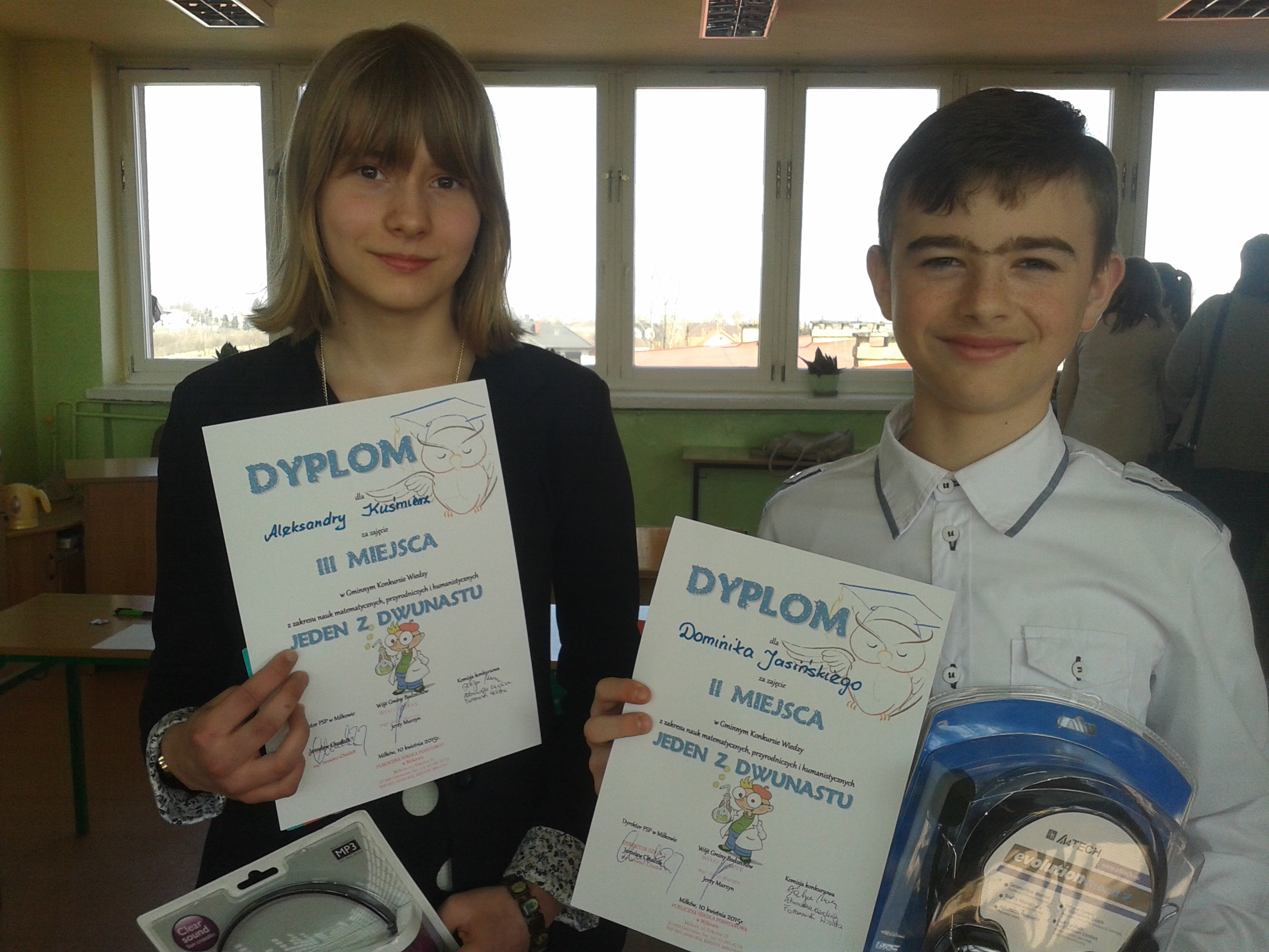 10 kwietnia w Publicznej Szkole Podstawowej w Miłkowie odbył się konkurs „Jeden z dwunastu”, który sprawdzał wiedzę z zakresu języka polskiego, matematyki, historii i społeczeństwa oraz przyrody. Pytania miały zróżnicowany stopień trudności, ale przebrnąć przez nie i pokonać stres związany z odpowiadaniem na czas, to było nie lada wyzwanie! Naszą szkołę reprezentowało dwoje uczniów i oboje znaleźli się na podium!