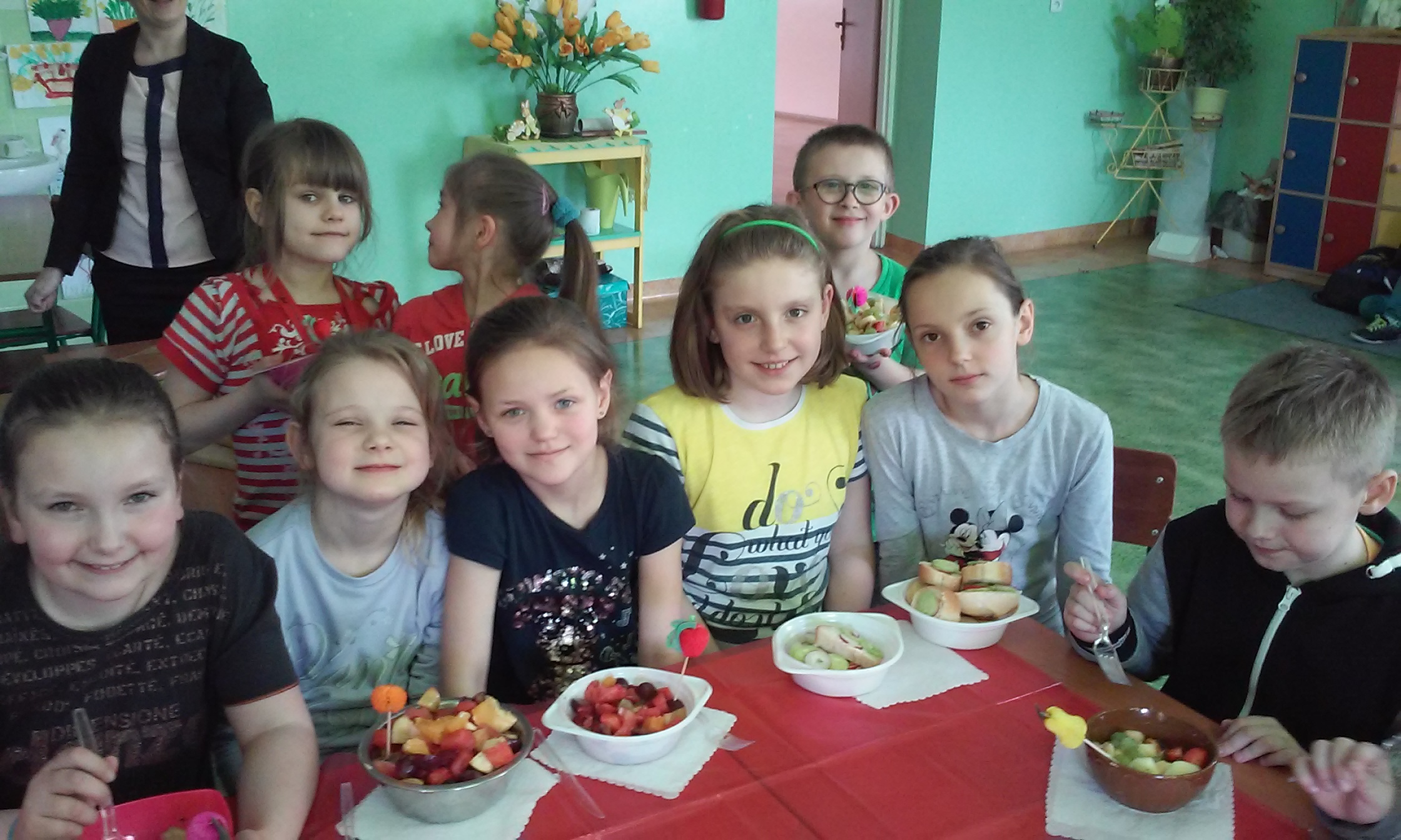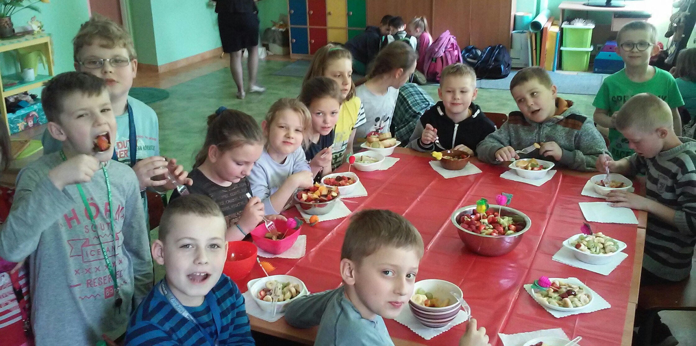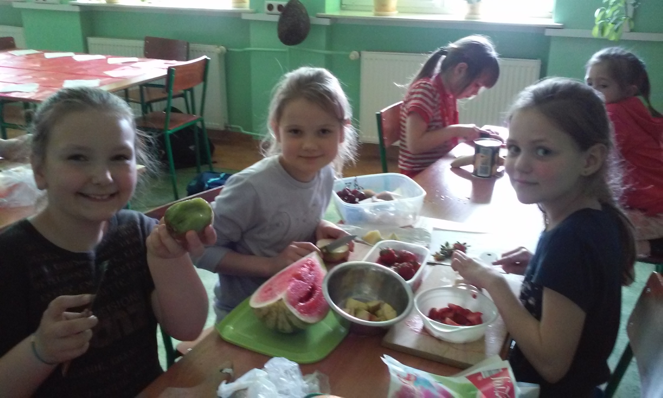 Dnia 24 kwietnia 2015 roku wychowankowie świetlicy wraz z paniami Katarzyną Bień, Marzeną Kazimierską i Anetą Kasprzyk wykonały sałatkę owocową. Zajęcia te poprzedziła pogadanka nt. piramidy żywnościowej oraz produktów, które zawierają najwięcej witamin. Na stołach królowały zarówno polskie jabłka, truskawki jak i bardziej egzotyczne owoce - mandarynki, melony, arbuzy, ananasy. Podczas krojenia uczniowie byli bardzo skupieni, ale w czasie posiłku zachwytom oraz ... dokładkom nie było końca.