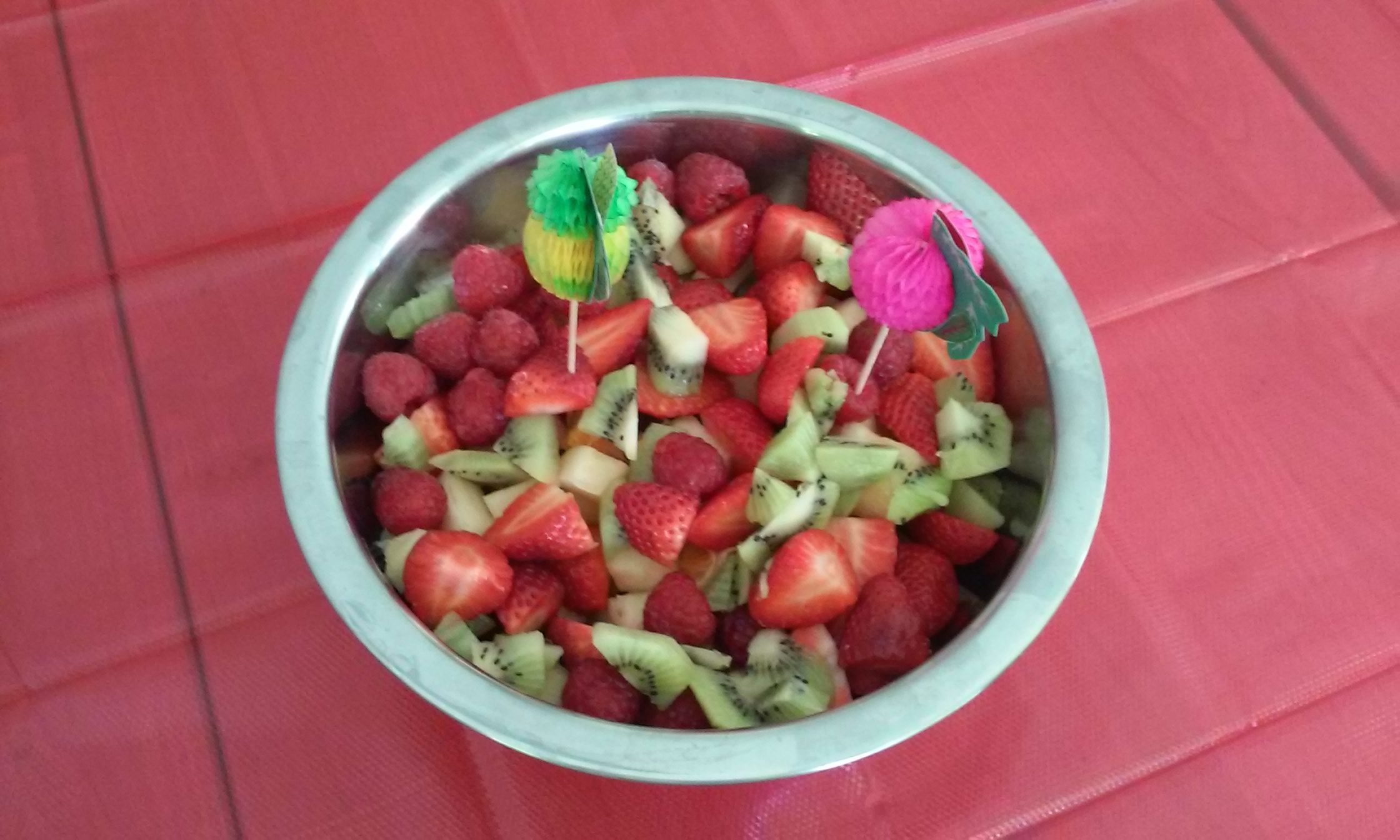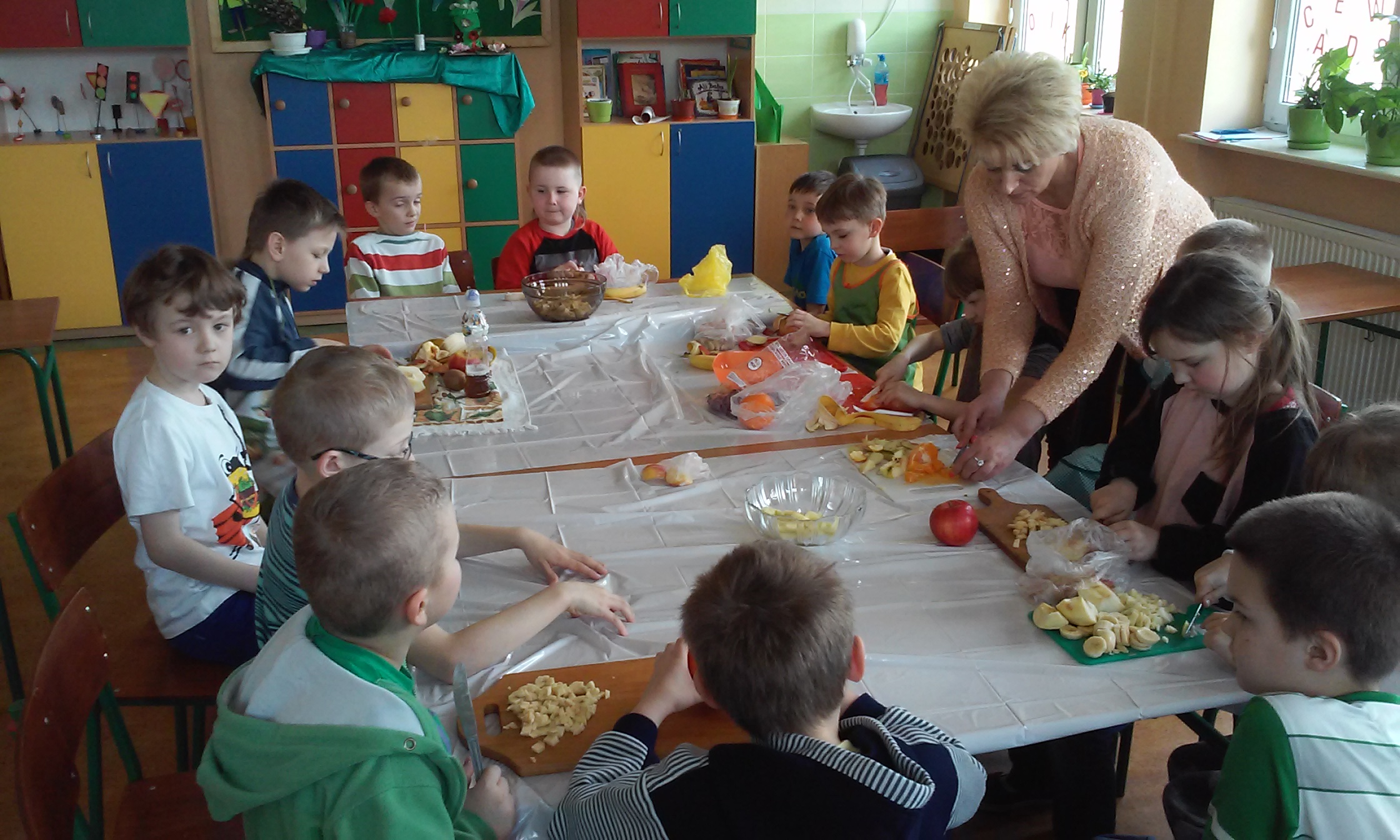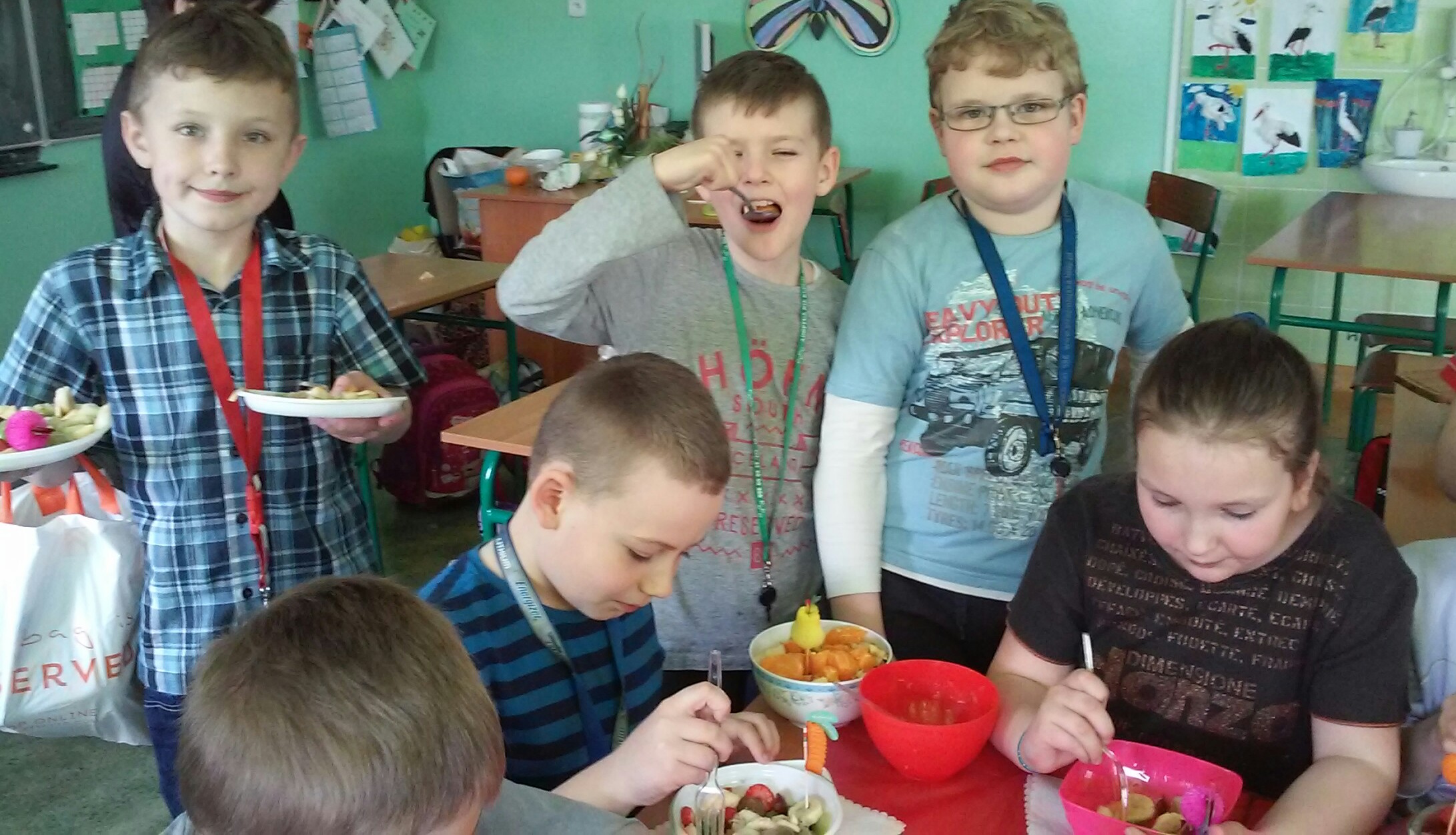 Dnia 24 kwietnia 2015 roku wychowankowie świetlicy wraz z paniami Katarzyną Bień, Marzeną Kazimierską i Anetą Kasprzyk wykonały sałatkę owocową. Zajęcia te poprzedziła pogadanka nt. piramidy żywnościowej oraz produktów, które zawierają najwięcej witamin. Na stołach królowały zarówno polskie jabłka, truskawki jak i bardziej egzotyczne owoce - mandarynki, melony, arbuzy, ananasy. Podczas krojenia uczniowie byli bardzo skupieni, ale w czasie posiłku zachwytom oraz ... dokładkom nie było końca.